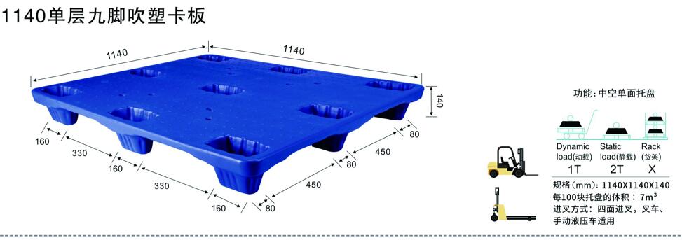 ● 吹塑托盤承載能力:靜載荷:6~7T;動載荷:1~2T;架空載荷:1~1.5T。